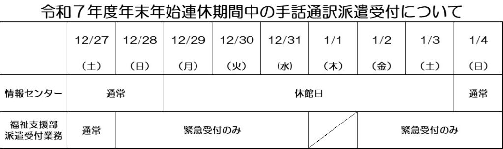 この期間以外は、通常の派遣受付になります。事前に依頼があったものは、年末年始の休館日でも手話通訳者を派遣します。